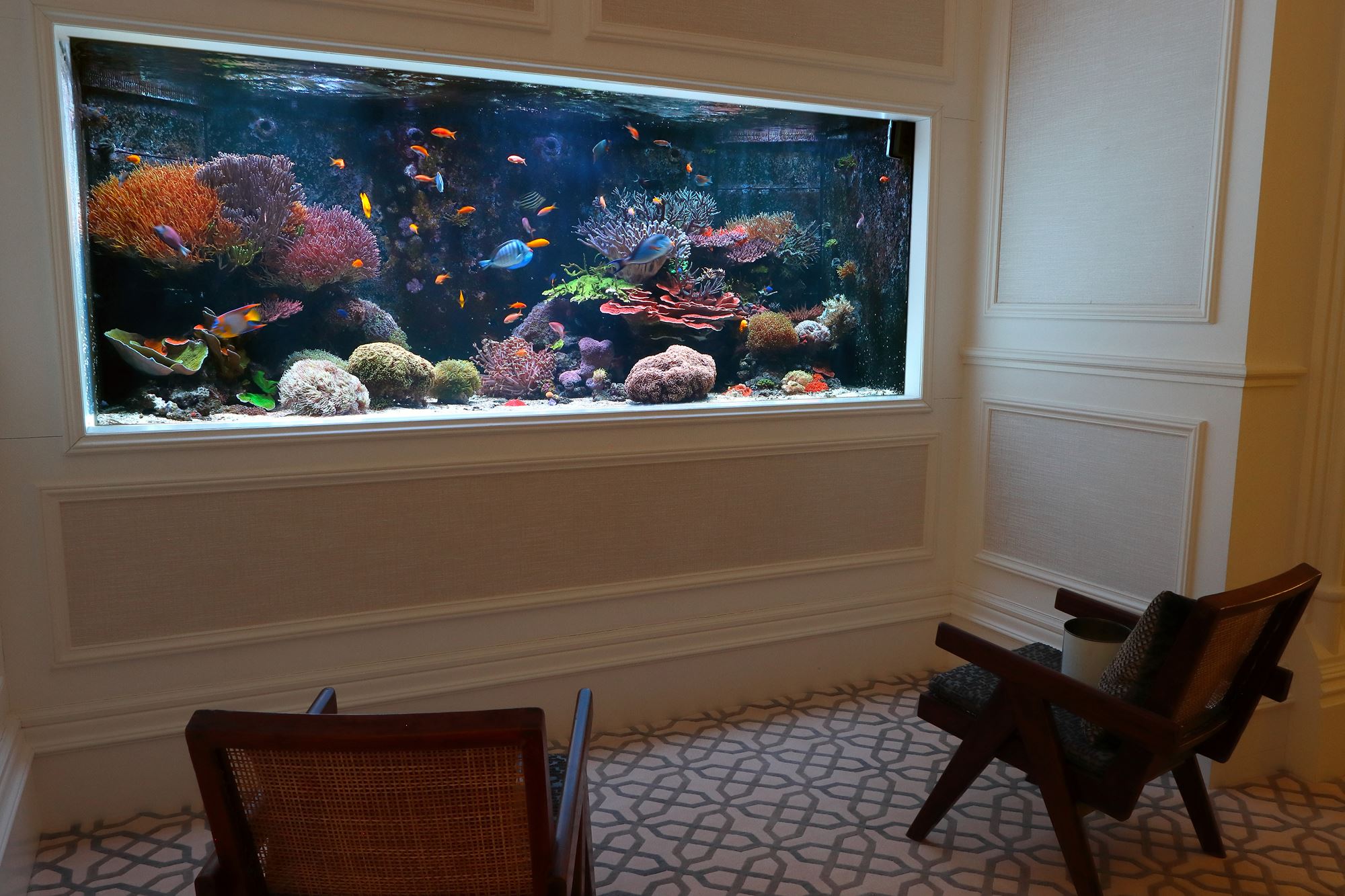 In wall reef aquarium in London. A 1700 litre bespoke tank stocked with a variety of marine fish and live corals.
